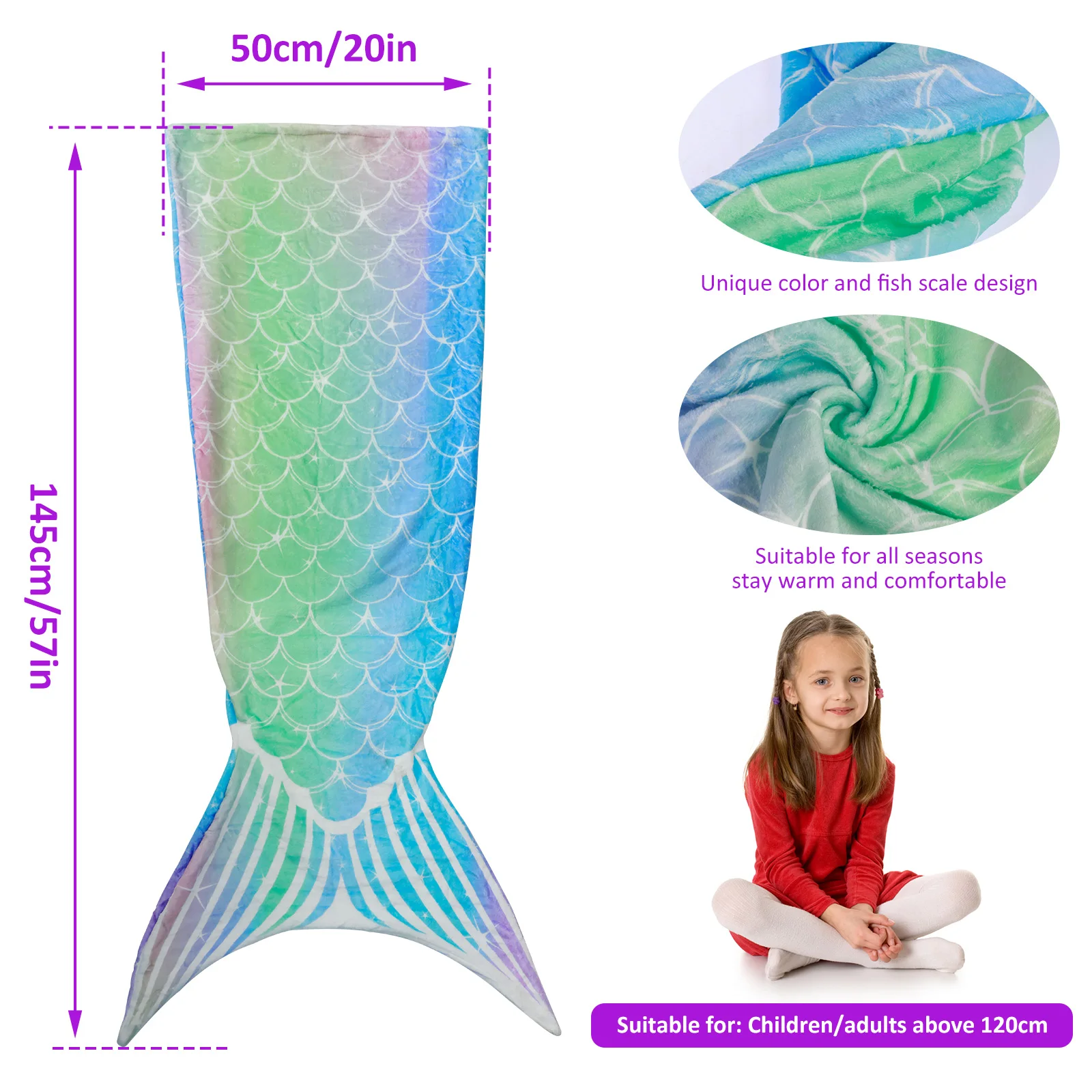 [Ultra-Soft Flannel Material] This mermaid tail blanket is made of high quality flannel material, ultra-soft, cozy and breathable, won't stimulate children's skin, suitable for keeping your child warm and cozy in all seasons.