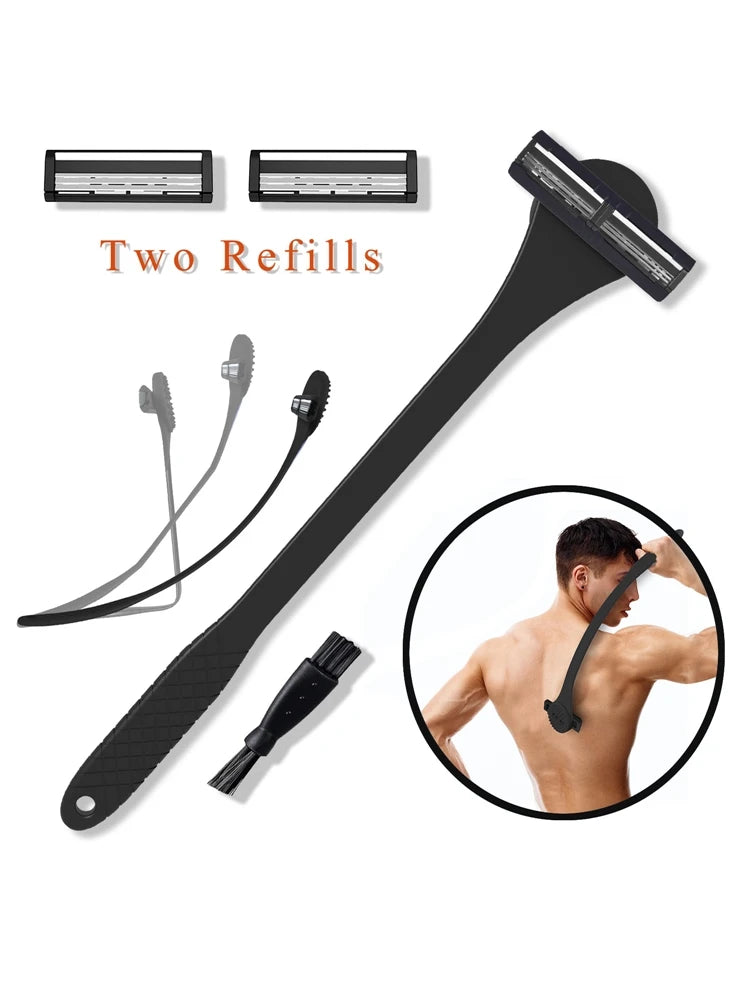 2-in-1 Back Shaver & Massage Brush – Flexible Handle Razor for Wet & Dry Body Hair Removal, 8 Replaceable Blades, Portable Groom